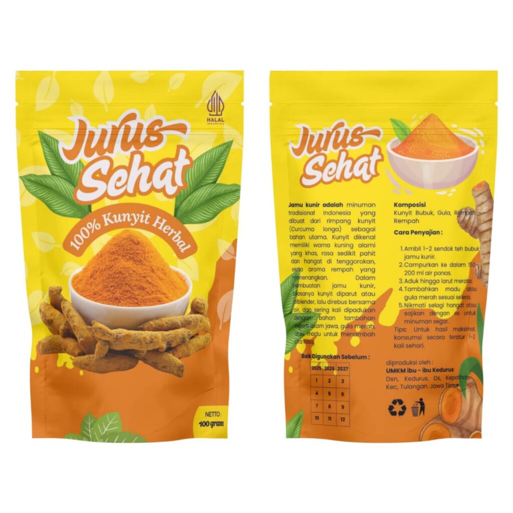 Hasil paling nyata terlihat dari perubahan kemasan. Jika sebelumnya jamu dikemas sederhana dengan plastik polos, kini tampilannya lebih modern, segar, dan informatif. Produk dengan merek “Jurus Sehat” dilengkapi logo, ilustrasi kunyit, informasi komposisi, cara penyajian, manfaat, tanggal kedaluwarsa, hingga sertifikasi halal.